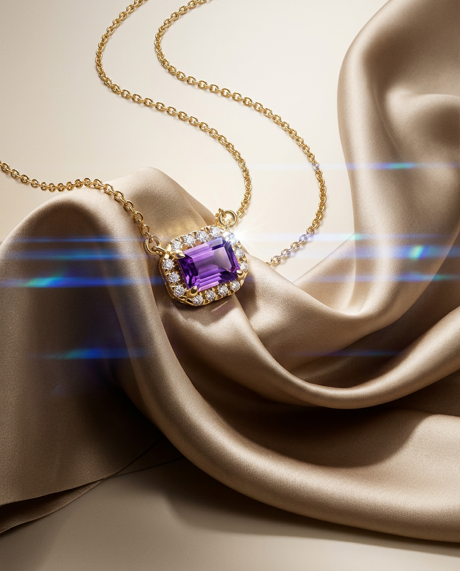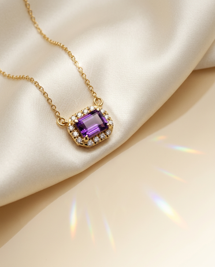 The deep purple gemstone is showcased in a sleek, polished 14k gold setting, offering a modern yet secure design that enhances the stone’s regal hue while ensuring durability. The rectangular halo arrangement adds a graceful symmetry, making this 14k gold necklace a symbol of refined luxury and natural beauty.